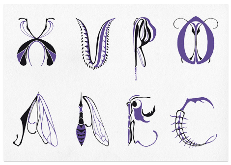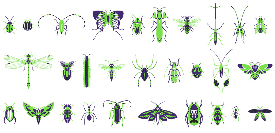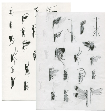Zweifarbige Kapitelvignetten für das Buch »Insektopädie« und Entwurfszeichnungen.